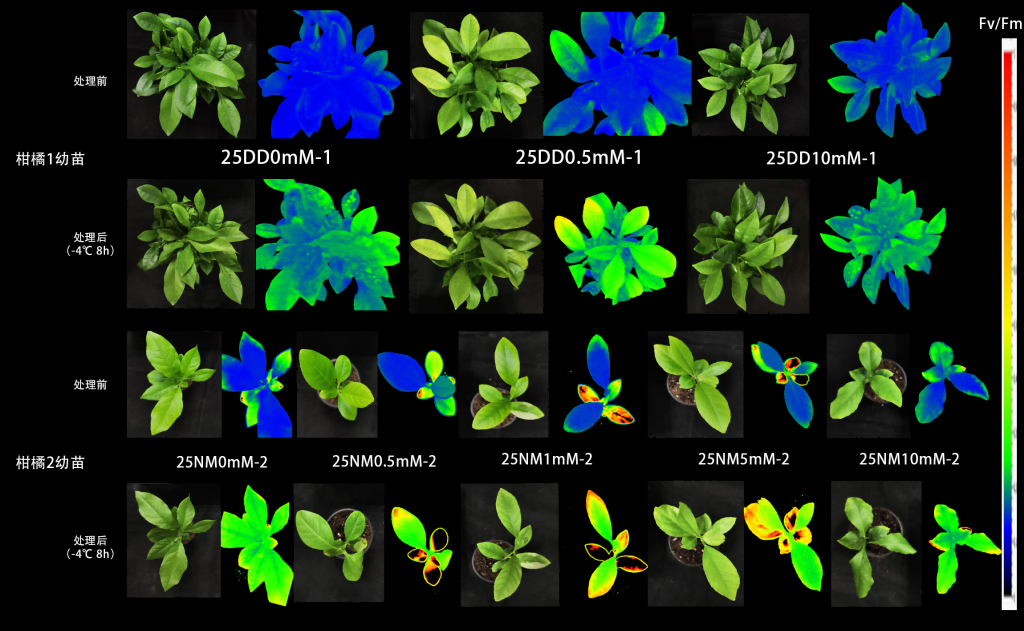 近日,浙江大学果树科学研究所的研究团队将由杭州绿色思维智能科技有限公司研发的 FluorVision X1叶绿素荧光成像系统成功应用于柑橘苗的低温胁迫研究中。该研究项目中要求对定向基因编辑后的柑橘幼苗在低温环境胁迫下(-4℃,8h)的响应进行测量和研究。研究不仅要关注整体植株的响应,还要分析不同叶片区域、不同叶龄叶片对低温胁迫的敏感性和恢复能力的差异,实现从整体到局部的全方位解析。通过FluorVision X1,研究人员实现了对植物光合系统II的实时、非损伤、可视化监测,将抽象的生理响应转化为直观的色彩图像和精确的量化数据。